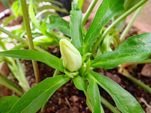 鉢植えのクリスマスローズ。白い蕾が膨らみ始めました。