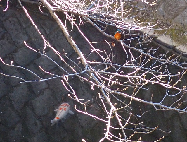 カワセミとヒゴイ。マゴイも何匹もいるので、ここで蛍は飛びません。