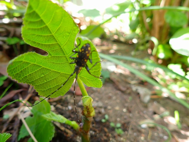 イチジクの木に放しました。眩しいのか、しばらく葉裏から