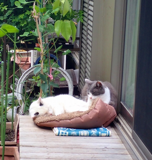 わが家の朝の縁側。16歳の兄妹の体調は、まずまず。