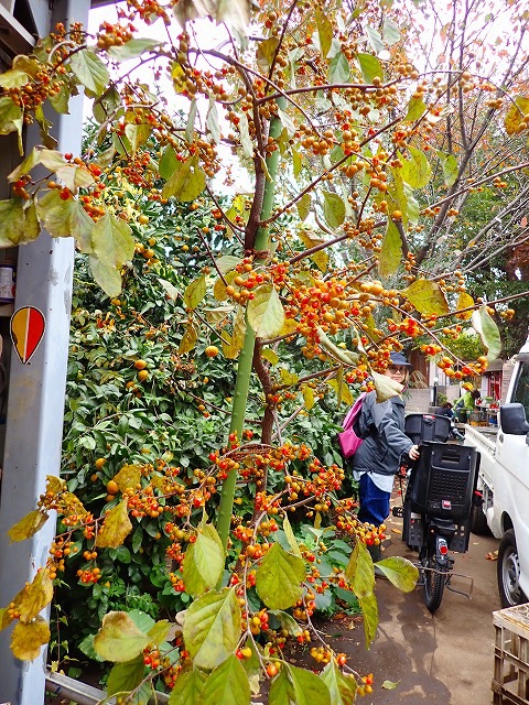 農家の方の中庭では、ツルウメモドキの実が熟していました。