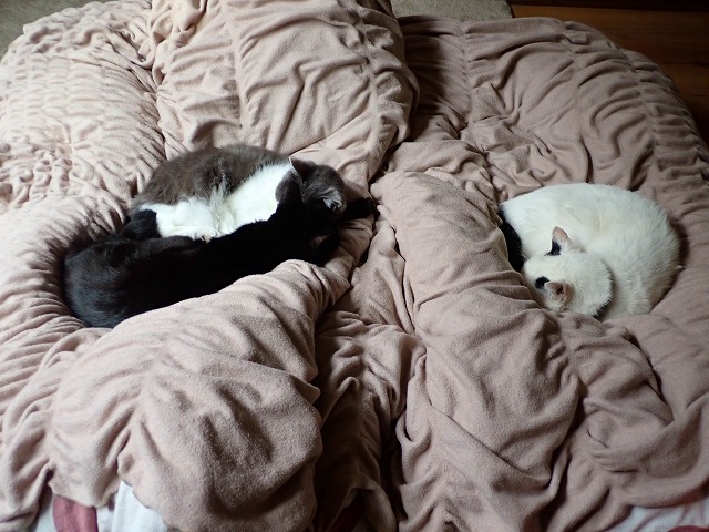 外気温5℃の寒い朝でした。猫の姉妹はまだ爆睡。さっきまで