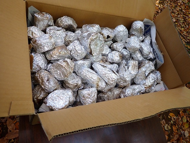 焼き芋は学校にもどってから、いただきます。「いま、食べたい」と
