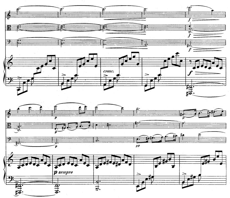 ここが非常にかっこいい。第1ヴァイオリンは 4e corde. (G線で)という指定があり、太い音でぐんぐんと迫ってくるのが泣かせる。ピアノが少しちょっかいを出したあと再度弦のみが自立し、
