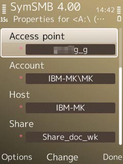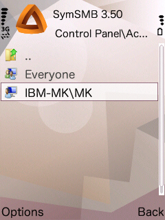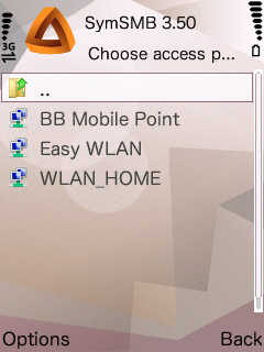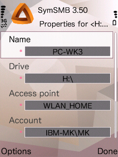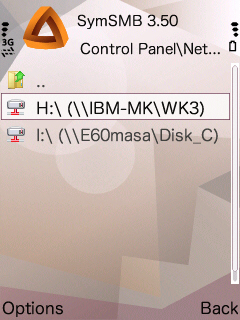 2つめのNetwork neighbourhood の中です。携帯電話→設定→アクセスポイント で設定してあるアクセスポイントがリストされ、クリックすると、そこにぶら下がっているフォルダ(上図のフォルダなど)が見られます。左図では、WLAN_HOME が家の無線LANです。