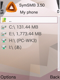 My phoneの中です。自分のディレクトリC:、E:と、設定したPCの共有フォルダ(左図ではH:)や、やはり設定した他の携帯電話のフォルダ(左図ではI:)がリストされます。これをクリックすれば、そのフォルダ内容を見ることができます。