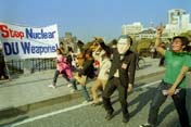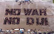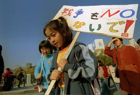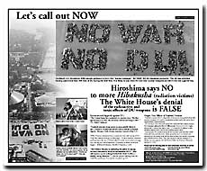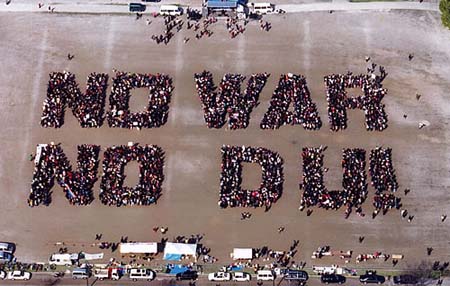 NO WAR NO DU!をセスナの狭い窓から撮影しました。 空にまで、集まった6000名の気持ちが伝わって着ました。 豊田の仕事は、その平和への気持ちを世界に届けること。この日は借り物でしたが、デジタルの一眼レフを使って、その日の内に通信社を通して世界に人文字のメッセージを流すことが出来ました。 (2003年3月2日) 空撮1 空撮2 デモ1 デモ2 『ニューヨークタイムズ』3月24日号