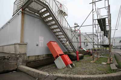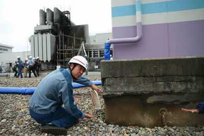 地震による敷地の陥没は最大1.6メートルにも達し、絶縁油の火災を引き起こしただけでなく、その火災を止める消火設備も破壊され、また、原子炉からの排煙設備も破損させた。(7月21日午後)