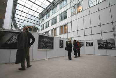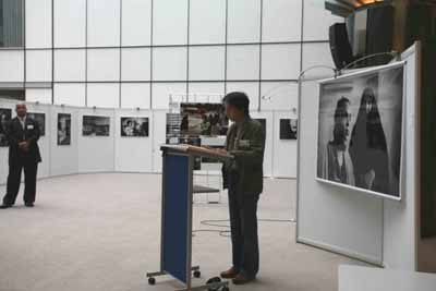 2、EU議会でのロビー活動としての写真展 こうした苦い経験と、それを克服する人類の平和への意思を示して、さる3月、ベルギー議会の国防委員会は「劣化ウラン弾禁止法案」を、全会一致で可決した。これまで通常兵器としてきた劣化ウラン弾、や劣化ウランを用いた装甲の、ベルギー領内での製造、使用、貯蔵、売買、入手、供給、移送を、禁止するものだ。今後、国防委員会の決定は、その決定が全会一致であったため、本会議での審議は形式的に進められるという。「唯一の被曝国」と言葉だけで繰り返し、クラスター爆弾の禁止条約にすらも反対する日本政府との大きな違いも明らかになったというべきだろう。それはともかくとしても、ベルギーでの議決は今後の劣化ウラン兵器の国際的禁止へ大きな一歩となったのは間違いない。そのベルギーに本部を置く欧州議会のホールで私の写真展『ウラン兵器の人的被害』が開かれた。昨年、ヒロシマで開かれたICBUW(ウラン兵器禁止を求める国際連合)の大会で、私の写真を見たベルギーのメンバーが、欧州議会の欧州緑の党・自由連合に紹介して実現したもの。EU議会ビル3階大回廊の展示会場で開かれた5月14日のオープニングセレモニーにはオランダ選出のエルス・デ・グローエン議員やドイツ選出のアンゲリカ・ベール議員などが熱のこもったスピーチに、約100名の参加者が耳を傾けた。今後、写真展はヘルシンキ、ローマなどへの巡回が予定され、劣化ウラン禁止の波が欧州全体に広がっていることを実感した。