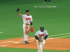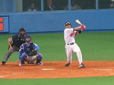 | ネクストで礒部と・・ 『あの投手って去年 ローズにエルボーされた 投手じゃない??』かな? |