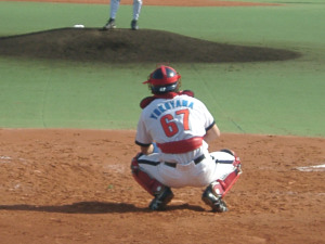 途中から長坂選手に代わって 横山選手がマスクを被りました。 ベテランの門倉選手と ルーキーのバッテリー。 緊張したりしないのかな? |