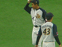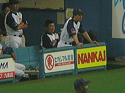 | 仰木監督の横に | 二人で熱心にお話中 | 首脳陣の中に座っていると なんだか首脳陣に見えてきた(笑) |