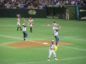 | 試合前に少年野球チームが ノックをして球場体験。 いいなぁ〜。私もしたいよ〜。 |