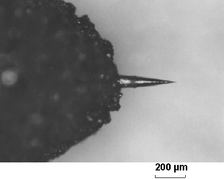 次に、含浸電極型液体金属イオン源の作製法について述べる。材料のタングステンパイプは外形〜2mm、内径〜1.5mm、長さ18mmである。銅の細い棒(外形はタングステンパイプの内径に相当する)にCVD装置でタングステンを厚く成膜し、銅部分を化学的なエッチングで取り除き成型したものである。粒径が10μmと100μmのタングステン粉末をニトロセルロースを20%含むアセトン溶液で充分練り、タングステンパイプの一方に盛る。外径が250μmのタングステン針を盛り上げた粉末に刺し、図3−5に示すような形状を形成する。乾燥させた後、1300℃の水素炉に1〜2分入れ、軽く焼結する。次に、0.1〜1NのNaOH水溶液に先端の針(ニードル)を入れ、水溶液中の銅電極とイオン源構造体間にAC2〜10V程度を印加し、電解エッチングによりニードル先端を0.1μm以下の曲率半径になるように加工した。このようにして作製したイオン源構造体の先端部分の写真を図3−6に示す。
