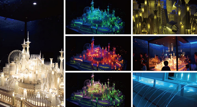 東京湾アクアラインの海ほたるパーキングエリア内に常設されることになった伊藤航氏の紙とスチレンボードを使った作品のために照明演出の協力を行いました。海の上のお城の造形の複雑さをより表現出来るよう外側から光を当てるだけでなく、伊藤氏の協力によって模型内に光ファイバーを約2,000本ほど取り付け、あたかも人が住んでいるような街並みを表現することが出来ました。