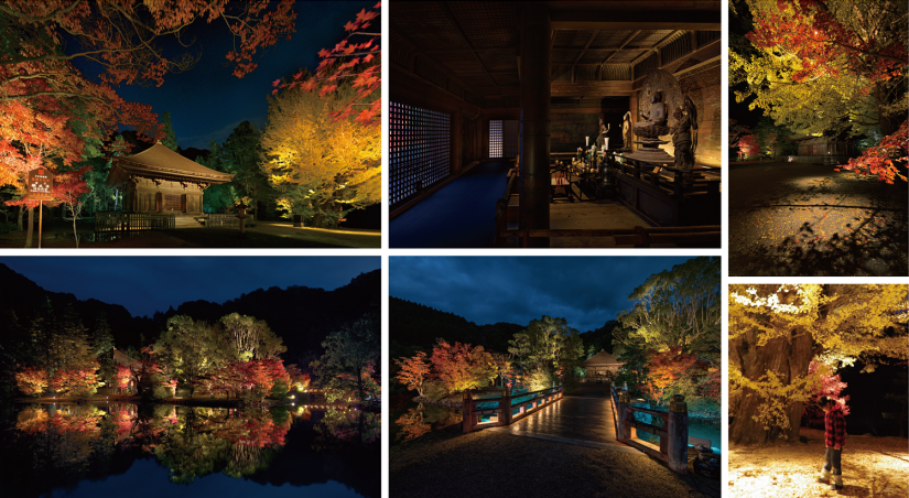 照明器具は全てLED、電力はソーラーパネルを利用して供給するエコロジーな紅葉ライトアップのイベントを行いました。福島県いわき市にある阿弥陀堂の歴史性を強調し、浄土庭園である多様な樹木の配置を生かすように照明計画を行いました。ライトアップだけでなく、いわき市の天然記念物となっている大イチョウには、小型のスポットライトを取り付け、ライトダウンを行い、落ち葉の木陰も楽しむことができます。