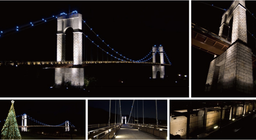 主塔の石の仕上げは下からライトアップを行うことで、より重厚な印象となり、歩道照明の暖かな光との対比効果を狙って主塔は白色光で照明し、吊り材の交点には風をイメージさせる青色LEDを設置して、橋梁の形状を夜間でも浮かび上がらせています。