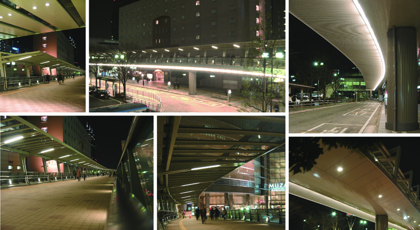 川崎ミューザデッキは川崎駅西口とミューザ川崎をつなぐ有効幅員約7.5m、橋長約125mの歩行者専用デッキです。ベースの明るさはガラスのシェルターを支える梁と一体化させた特注ライン照明と高欄の支柱に内蔵させた足元灯で確保しています。