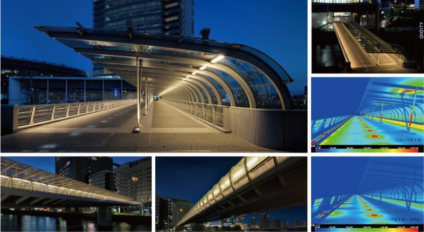 横浜駅からみなとみらいへのゲートとなる歩行者専用デッキとして、照明器具を橋梁デザインと一体化させ、昼間の景観を損なうことなく、夜景ならではの価値を高める照明デザインとしました。