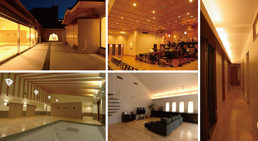 建替え工事に伴い、久成寺とご住職の二世帯住宅である庫裏の照明計画を行いました。地域住民には従来のお寺同様の親しみやすさを感じて頂けるように荘厳ながらも明るい印象になるように配慮しました。
