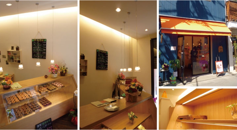 街に位置するドーナツ専門店。昼間でも室内が明るい雰囲気に感じるように壁面を間接照明し、連続的に設置したペンダントはアイキャッチとなっています。棚下照明は、器具が見えないように棚に組み込み、ドーナツや焼き菓子が均一に明るくに見えるように配慮しています。