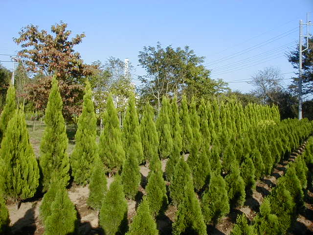 コノテガシワエレガンテシマ(ストリクタ) 原作国 中国 最大樹高 約6m 特徴 中国原産のコノテガシワの改良品種。 日本の蒸し暑い気候にも適し丈夫。 肥沃な土地を好む。 根はコニファーの中では比較的細かく移植に強い。 剪定なしでも円錐形のスリムな樹形を保つ。 冬は葉の色が茶色に変化。 比較的安価で用途も広く最もポピュラーな品種。 出荷の様子