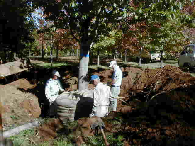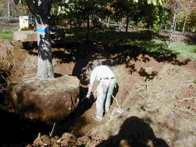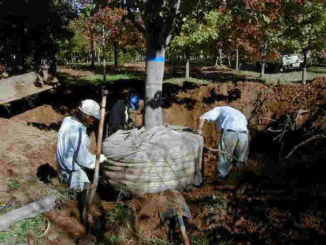 ユンボと呼ばれる機械で根鉢の周りの土を堀上げて手作業で根鉢の形を整えます。