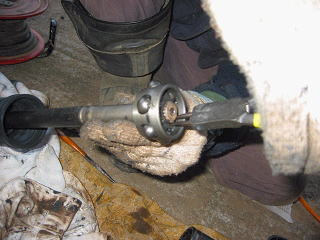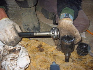 破れているのは車輪側のブーツですが、デフ側の自在継ぎ手を外してからでないと外側のブーツが交換できません。