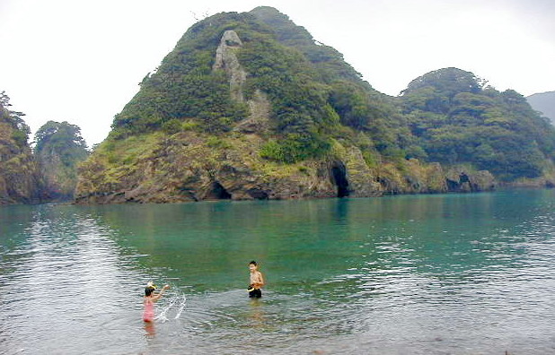 対岸の尊之島までは、100mほどで泳いで 渡る事が出きる。 島の左の岩場にはチョウチョウ魚やタコが いるが潮の流れが速いので注意が必要。 |