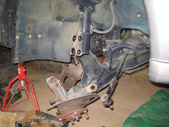 ナックルとタイロッドエンド、ナックルとショックの取り付け部を外しドライブシャフトを抜き取ります。