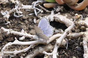 昼に土手を歩くとベニシジミが地面に止まっていました。 |