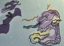 カードの辰のモデルは、1999.10.14に渋谷郵便局の福岡県のふるさと物産展で、実演販売をしていた土鈴です。物産展会場で、自分で絵付けをさせてくださったので、とても想い出深く愛着のある辰です。下地に金を一面に塗り、胸の銀、全体にグリーン、口と炎に赤を差し、最後に目に黒を入れました。昼休みのことで、20分くらいで大急ぎで仕上げました。最後に裏にサインを入れたのですが「1999.10.14 Naoko.S」と書いたつもりで「19999.10.14・・・」となっていました。(>_<)