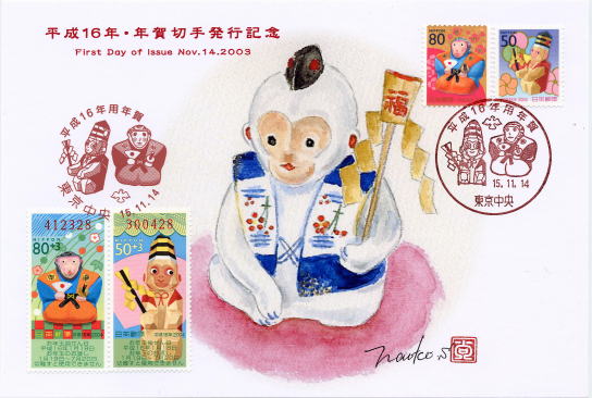 平成15年年賀切手には4種の干支土鈴が選ばれているが、わたしは昨年と同じシリーズの陶製干支人形を選んだ。実際の人形はもう少しおすましな感じだが、わたしはにっこり笑っているような表情にしてみた。(^.^)