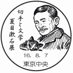| 今年は、漱石が「吾輩は猫である」を発表してから100年の記念の年にあたるそうです。また1000円札の漱石が消える年でもあります。 夏目漱石像にはこどもの時から親しんできましたが、絵を描くとなると・・・? 実は昨年12/17、神田北神保町局の風景印使用開始のときに、ちょっと遊んだ絵を描いてみた。(下のカードをご覧ください) でも、個人的に描く絵と、誰が見ても「漱石展」だと分かるように描く肖像では訳が違う。 モデルはどの写真にしようか・・・? ![]() と、一昨年のJAPEXでも、漱石の小型印が使用されたので、他の写真がよいでしょうとのアドバイスをいただき、初めてそう言うものがあったと気付く・・・。(^_^.) 比べられるのは辛いですよね。(^_^.) コンピュータグラフィックスで機械処理した肖像ではなく、肉筆の血の通った、肖像が欲しい、と生意気なことを考えていましたが、段々プレッシャーが・・・。(^_^.) 因みに、この漱石はわたしが持っている本に出ていた写真をモデルにしたが、20世紀デザイン切手シリーズの耳紙に登場した肘を突いている漱石は「考えている漱石」でこちらは「考えていない漱石」らしいです・・・。(^_^.) ただ、肖像だけではつまらないので、小道具として「猫」を入れることにしました。「吾輩は猫である」に出て来る猫は斑ですが、漱石が実際に飼っていたのは、描いていた絵から、黒猫であるようです。この猫は、その漱石の絵をモデルにしました。元の写真が、猫を抱いている漱石、ではなくて、この位置に配してみたのです。 線だけで人の顔を描くのは難しく、それも、モデルが目の前に居ればよいのですが、昔のモノクロ写真は、実際どの位置が輪郭なのか、陰なのかよく分からず、苦労しました。 表情がよく描けたかと思うと、スーツの線がおかしかったり、何度も何度も描き直しました。(^_^.) 漱石と一葉を対にするため、できれば、向かい合う写真があればよかったのですが、それもなく、同じ形にまとめることにし、日本文学であるので、題名を縦書きにし、適度な行書体にしてみました。 ただ、日替わりになるか、日替わりだと、毎日来られない人には気の毒だが、3つの消印が認められるかどうか、その場合、題名が長くなる? など、いろいろ論議されました。まだ、申請どおりになるかどうかは分かっていません。 2004.6.17記 |