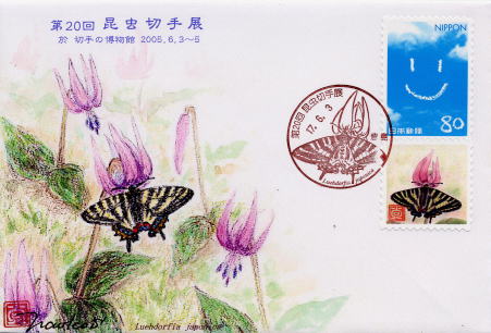昭和55年8月京都で第16回国際昆虫学会議が開催され、その記念としてギフチョウの切手が発行されました。それに合わせた切手展の小型印なども有り集めてみました。 |