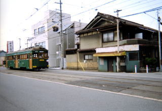 中央をチンチン電車が行き来していました。その道の反対側の西側には、自転車会館という建物があり、