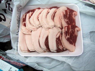 鍋が炊き上がるかというころ、いのしし肉を焼いてみようということになった。駅から歩いてくる時にしゃべった、いのししの焼き肉である。網に乗せ、山椒を降って裏返す。しゃぶしゃぶの肉のように薄いそれはすぐに焼き上がり、半信半疑で食べてみるとコレがまたうまい!山椒のおかげか、臭みもなくとろけるような舌触りも絶品。グラム1200円のロースはやっぱり違う。焼いてもまずぅて食えん、という意見はあっけなくひるがえされた。