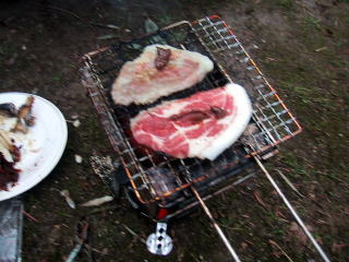 そんなこんなで、時計は12時を回り、いまだハッキリしない空の下、ボタン鍋の準備が始まった。コンロを出して火を起こす人、野菜を切って洗い行く人、水をくみに行く人、もうビールを飲んでいる人と、皆テキパキと動いている。初参加で何をどうしてえぇやらわからんし、かといってボーッとしてるのも何なので、ビールを開けて飲みながら見学するしかない。なんかえぇ匂いがしてきたなぁと思うと、キビナゴ?が焼き上がっている。その後、イワシのひらきも焼かれ、誰かれなしに箸を出してつまみ、食い、飲みながら、鍋の煮立ちを待った。キビナゴもイワシも外で食うとホンマにうまい。家で食うのとは全然味が違った。