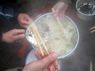そして、ついに鍋。右手に箸、左手に椀とコップを持った14人の大人がいっせいに群がり、あーでもない、こーでもないとワイワイうるさく、談論風発、勢いよく食べ始めた。肉は瞬く間に消え、残った野菜も数分でものの見事になくなった。一服する間もなく、カモ鍋である。手際のよいことに別のコンロですでに湯は沸いている。うどん出汁をどんどん放り込み、カモ、糸コン、ネギ、そしてうどんと次々に入れられる。フタをして数分、ボタン鍋の時と同じ光景が始まった。ビール、ワイン、日本酒、焼酎…好き勝手に飲みながら、やはり鍋は数分で空になった。