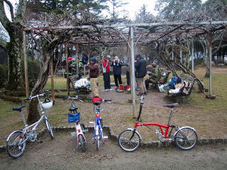 前日の雨は上がっていたが、曇りとも晴れともいえない中途半端な空模様。午前10時にJR三田駅から神戸電鉄のほうへ下りたとこで集合、とまだまださんからメールをもらっていたので、その通りに階段を下りていくと中段辺りで右手に白いヘルメットをかぶった人が小径車で走っているのが見えた。そのまま階段を下りきったところで、おっさんらの団体が目に入った。総勢十人かそこら。他にそれらしき集団が見当たらないので、キョロキョロしていたら、その団体の中にまだまださんが見えた。近付くいていくと、何やら、お金のやりとりをしている。そうするうちに、みんなどこかへ散らばっていき、まだまださんと二人きりになって雑談などしているところに、輪行袋を下げた人が現れ、中から赤い小径車を出して組み始めた。その人は北大阪サイクリングクラブの人で、かまぼこ屋をやってはると紹介された。しばらくして自転車が組み上がり、3人で会場へ向かった。