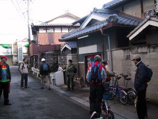 駅前からの道はのんびりと伸びていた。商店街はガランとしていて、人も車も往来が少ない。途中、神社のお供えの酒を買うため、橋のたもとにある酒屋に寄った。店内は小さいカウンターもあって立ち飲みもさせてくれる酒屋で、その小ぢんまりしたカウンターのほかに、ビールケースを椅子にしたテーブルもあった。店のおばちゃんに頼んで熨斗に輪行クラブ大阪と筆書きしてもらう。その落ち着いた筆さばきを3人はしばし見入った。