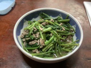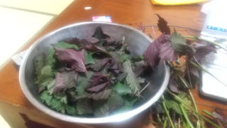 まだまださんは、さっそくその日の昼飯になりました。つるむらさきとミンチの炒め物。青シソは、冷ややっこに。