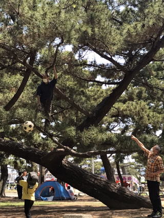 それを見た小さな男の子が、サッカーボールを下から投げ上げる、発想はいいがなかなか難しい。