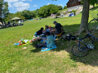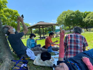 10時すぎに深北緑地に、来たなおやんとあっちゃんは木の下にシートを広げた。人出が多ければ影のない場所になるかと心配したが、いい場所がとれた。