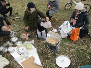 具材を入れて粕汁を作っていると、最後に自転車でそこねぇさんがやってきた。