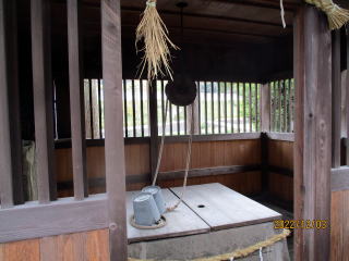 井戸の上のポリバケツは当時これを使ったとされ国宝に指定されている。