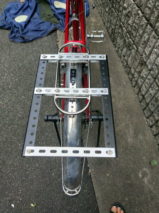 細長い板の端を荷台のネジ穴を下から止めて、反対側を泥除けの止めネジと結んだ。