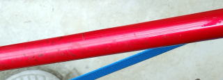 そこで、足を真っすぐに上に上げてトップチューブを越すことになる。そのためにトップチューブが靴の汚れがついてしまうこと。同様に下りる時も面倒になること。