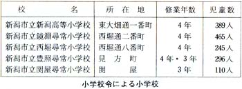 さらに小学校令は、一九〇〇(明治三三)年に改正されたが、新潟市では、○二(明治三五)年四月より実施された。 この時の小学校は右上の表のようであった。 |