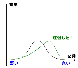自己ベスト勝負なら、そこそこ現実的な確率のラインが右の方にありさえすれば、左側の方の分布の形はどうでもいいわけです。一方、一発勝負の場合、最低ラインや平均ラインを右に寄せることが重要になります。